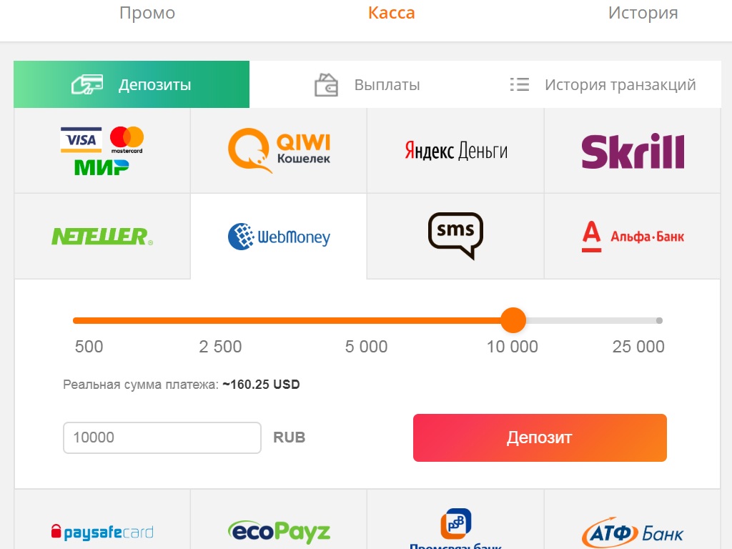 Количество платежных систем на официальном сайте и работающем зеркале Slot V не слишком большое, но здесь есть все необходимые рядовому гемблеру варианты. Список выглядит следующим образом: